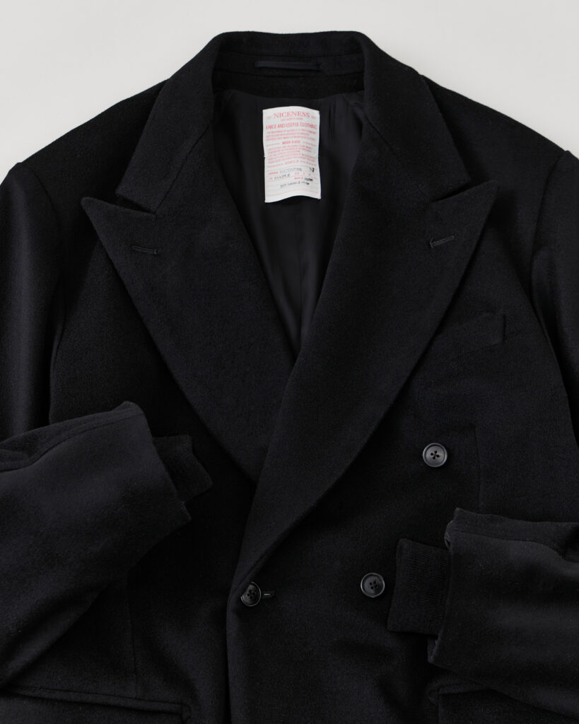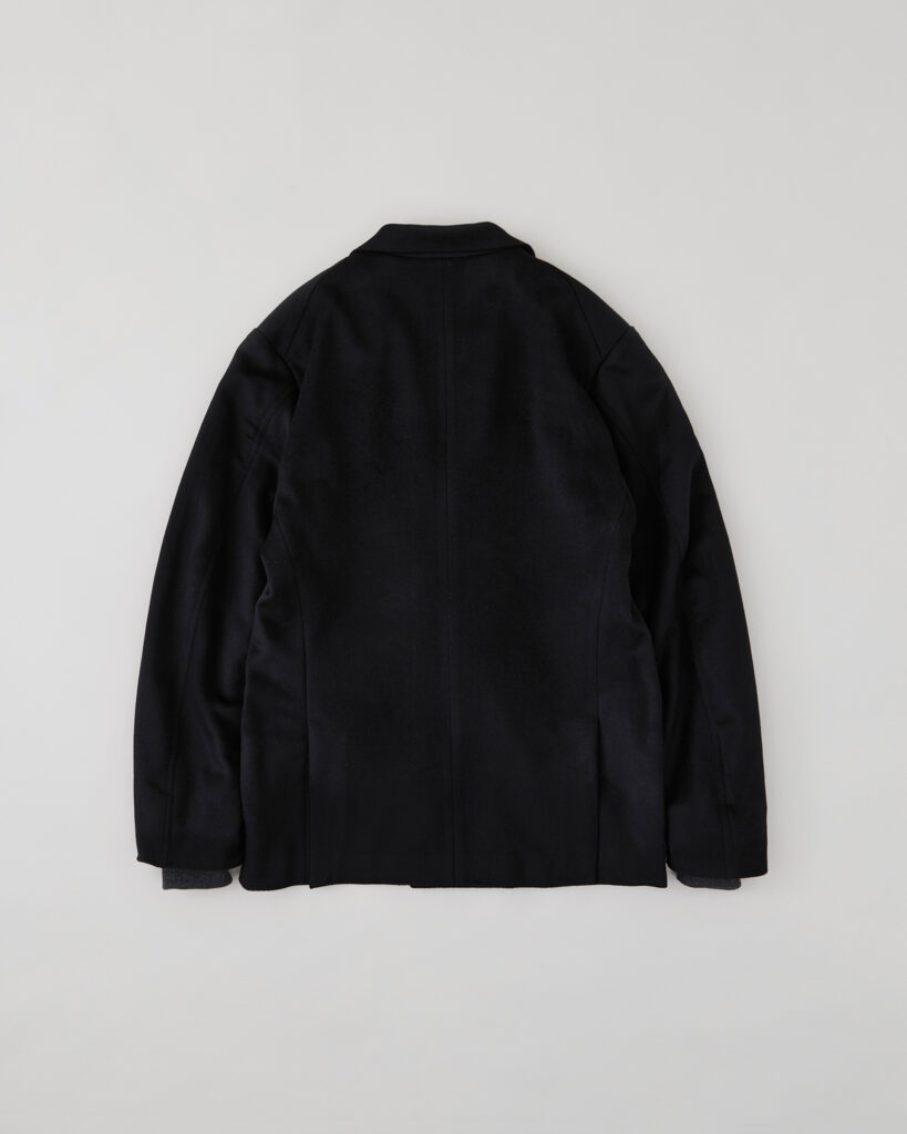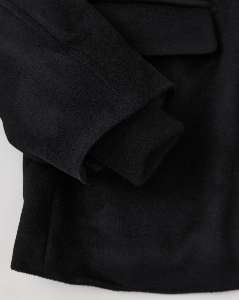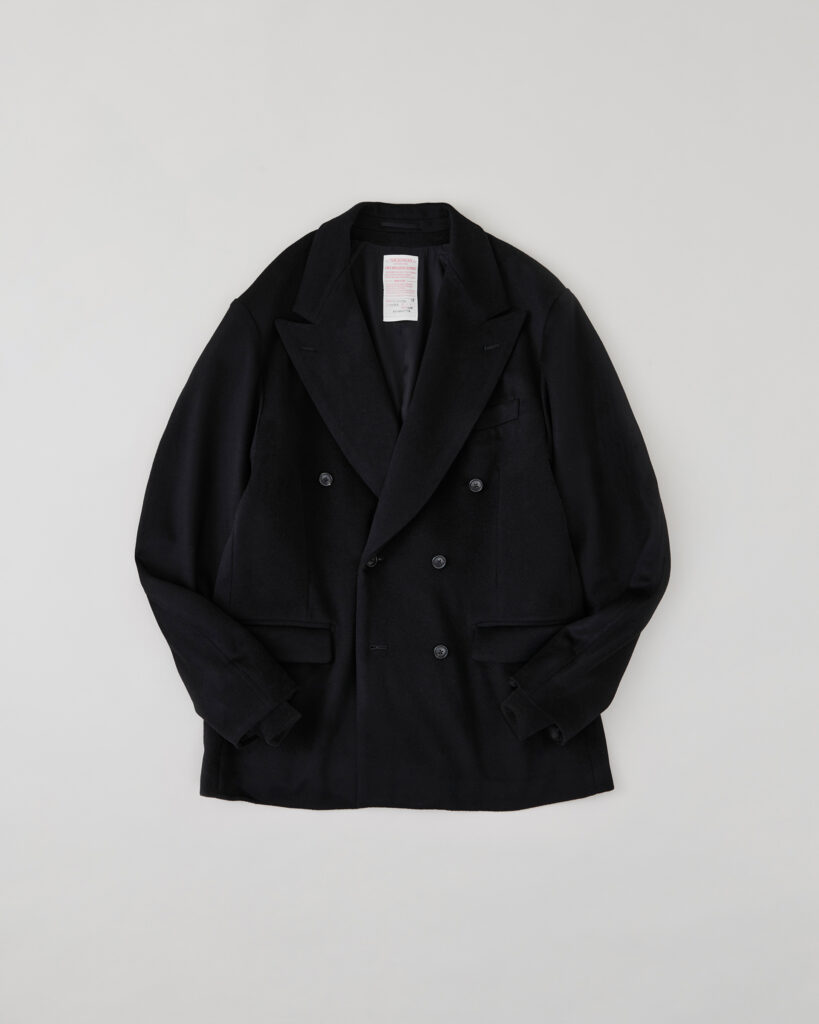デッドストックのイタリア産カシミア生地を使用したダブルブレストジャケット。1960年代のアメリカのフライトジャケットのスリーブ構造を取り入れ、クラシカルなドレス感のある本体と、フライトジャケットの立体的な構造を融合させたデザインです。身頃はテーラードジャケット専門の職人、袖まわりはミリタリーアイテム専門の工場に依頼し、それぞれの職域と技術を最大限に活かして縫製しています。袖の内側にはリブを取り付け、フライトジャケットを彷彿させるディテールを落とし込んでいます。