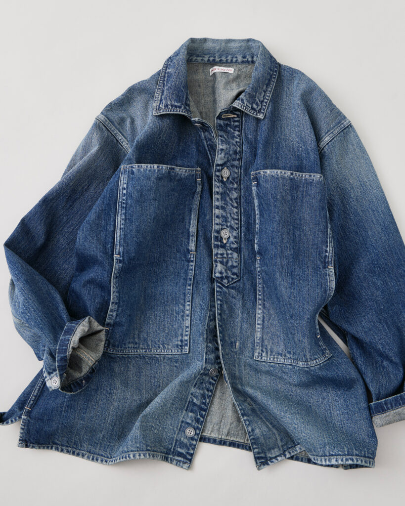 高品質な米綿を使用した12ozの白耳セルビッチデニムを用いたジャケット。1920〜30年代の米国陸軍のデニムプルオーバーをベースに、ポケット配置や前開き仕様など現代的にアップデートし、ブルゾンのように羽織れるシルエットに仕上げています。シャトル織機で丁寧に織り上げた生地は、重すぎず軽すぎない適度な厚みと柔らかさが特徴。着用を重ねたような縦落ちの風合いを表現するため、職人の手作業による加工が施されています。