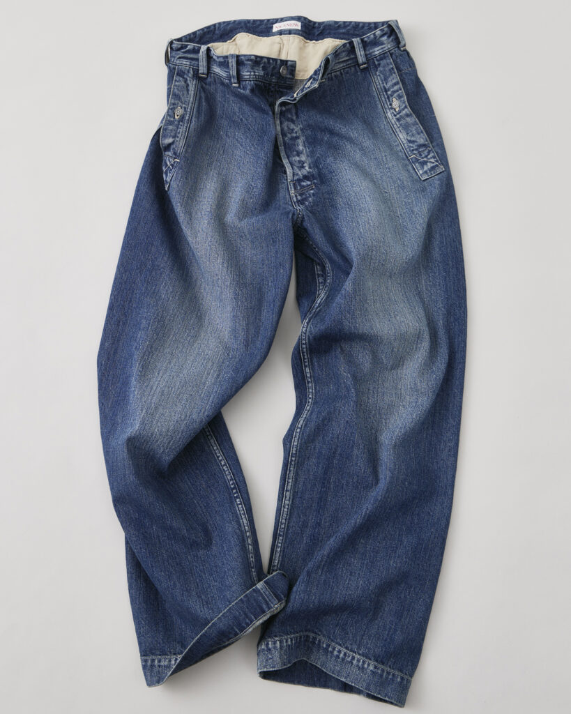 高品質な米綿を使用した12ozの白耳セルビッチデニムを用いたトラウザー。1920〜30年代の米国陸軍のデニムトラウザーをベースに、ワークパンツに見られる実用的なディテールを取り入れて再構築しました。シャトル織機で丁寧に織られた生地は、適度な厚みと柔らかさを併せ持ち、快適な履き心地を実現。ヴィンテージさながらの縦落ち感を表現するため、職人の手作業による加工を施しています。