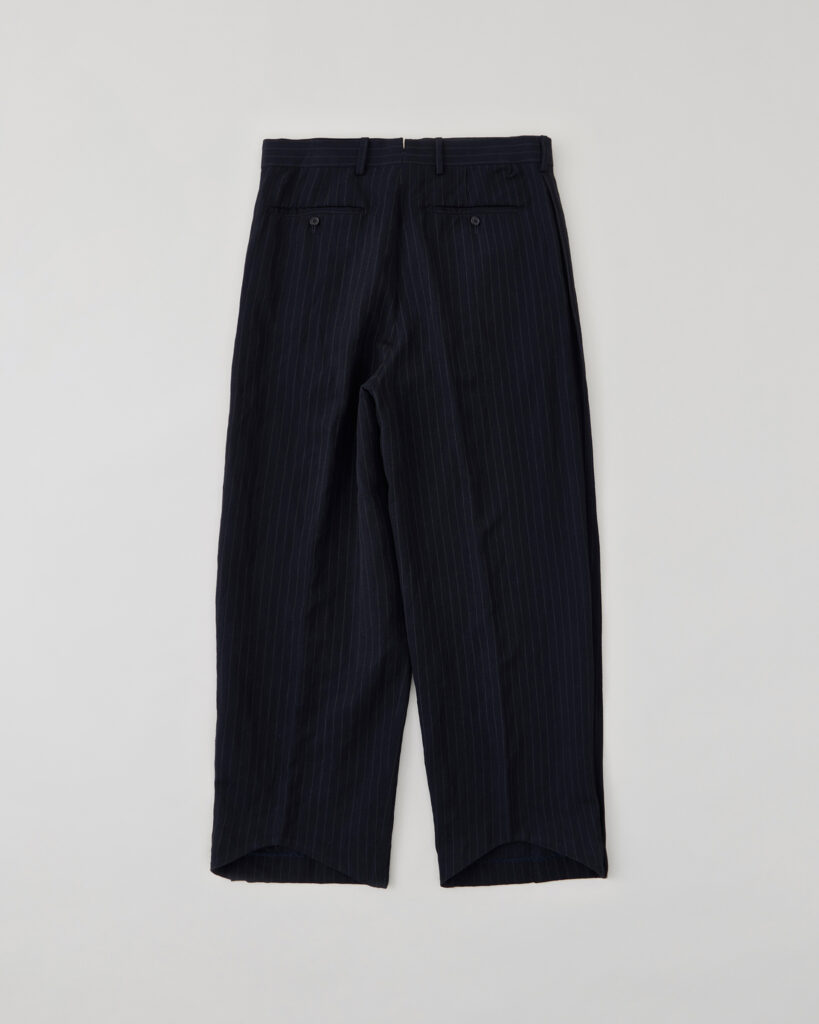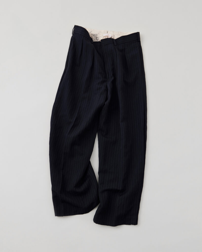 オーバーダイを施したストライプ柄のウールリネンギャバジン⽣地で仕立てたフライングVトラウザー。1960〜70年代のミュージックシーンから着想を得た、フライングVギターになぞらえた後ろ裾のV字型カットアウトが特徴的なデザインです。仕上げにはエアタンブラー加工を施し、程よく着古したような柔らかさと風合いを表現しています。