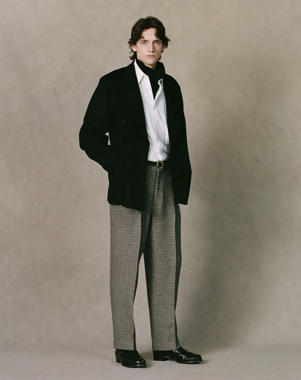 デッドストックのイタリア産カシミア生地を使用したダブルブレストジャケット。1960年代のアメリカのフライトジャケットのスリーブ構造を取り入れ、クラシカルなドレス感のある本体と、フライトジャケットの立体的な構造を融合させたデザインです。身頃はテーラードジャケット専門の職人、袖まわりはミリタリーアイテム専門の工場に依頼し、それぞれの職域と技術を最大限に活かして縫製しています。袖の内側にはリブを取り付け、フライトジャケットを彷彿させるディテールを落とし込んでいます。