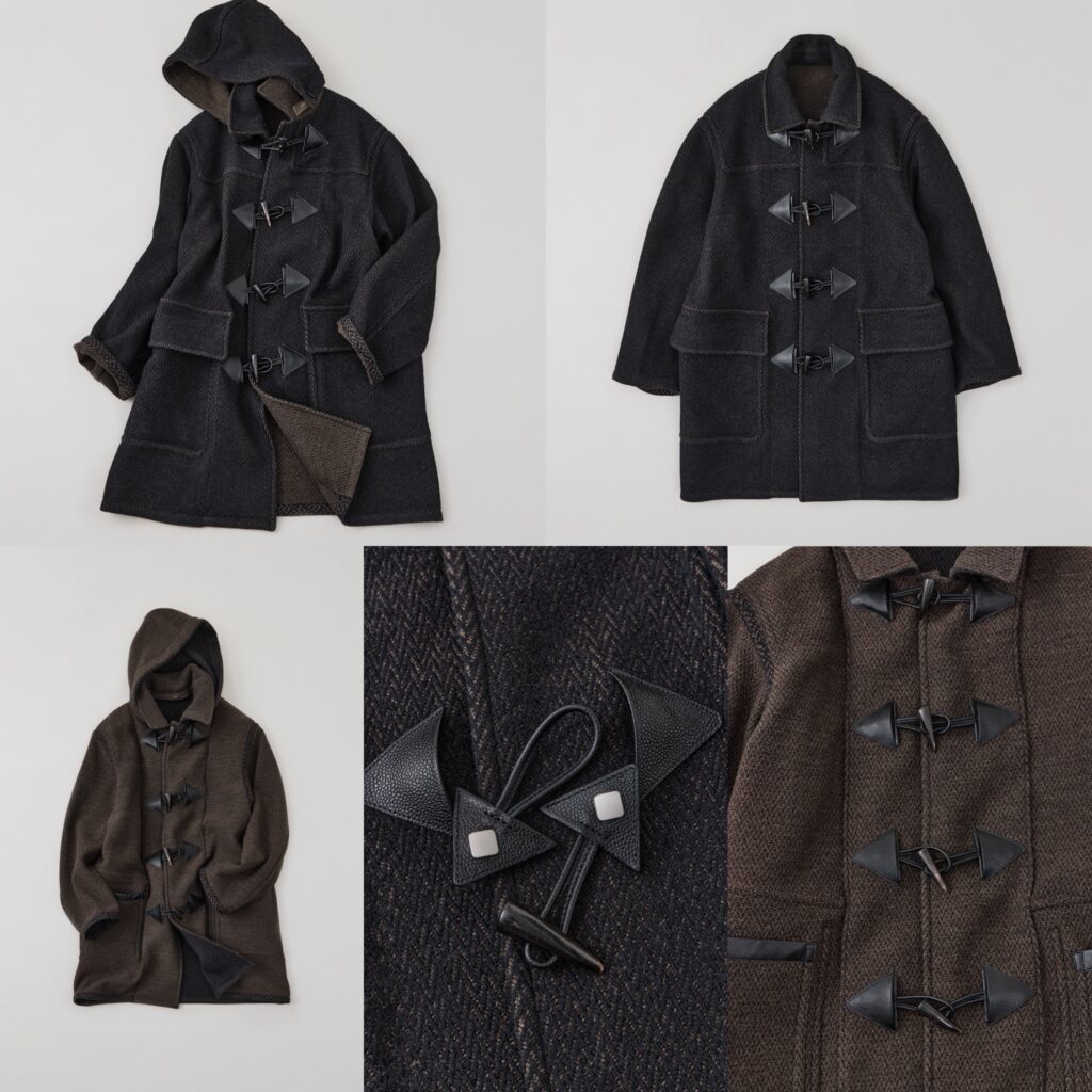 アメリカ産ウールとシェットランドウールのリリヤーン糸を使用したリバーシブルヘリンボーン生地で仕立てたダッフルコート。20世紀初頭のイギリス海軍で広く採用されたウールコートをリファレンスとし、様々な国のダッフルコートの要素を編集して現代的に再設計しています。フランスのHAAS社のアルザスレザーを使用したトグルパーツは着脱式となっており、ディテールや配色の異なる両面を活かして着用できるリバーシブル仕様となっています。