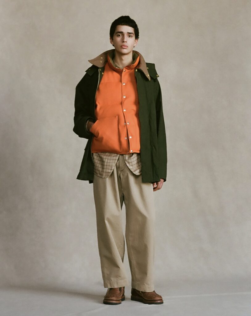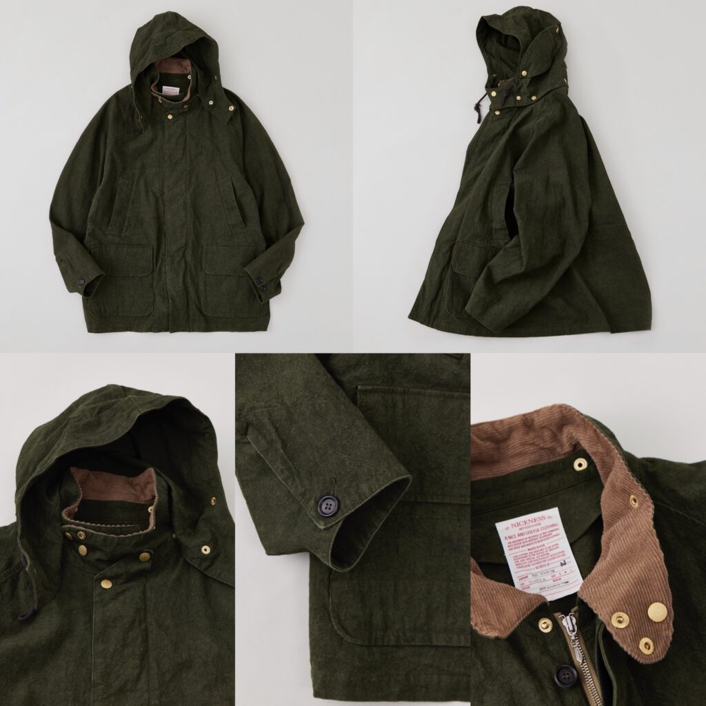 強撚コットンで織り上げたダック生地に、硫化染めとバイオ加工を施したハンティングジャケット。1950年代のアメリカのカバーオールとイギリスのハンティングジャケットの要素をミックスしたデザインです。生地は1930年代のアメリカ製ファイヤーマンキャンバス地を参考に製作されており、特殊な加工により、ヴィンテージ感のある色合いや凹凸感のある立体的な表情に仕上げています。襟まわりや前立てにはミリタリー由来のディテールを採用。フードは取り外し可能な仕様です。