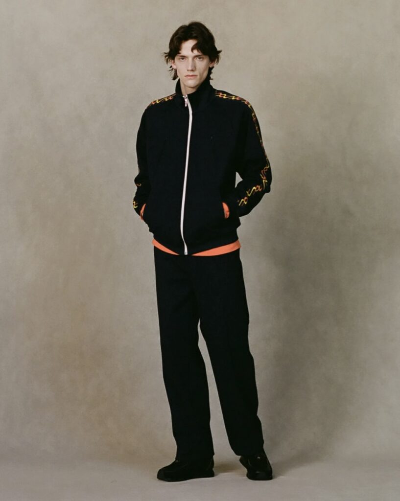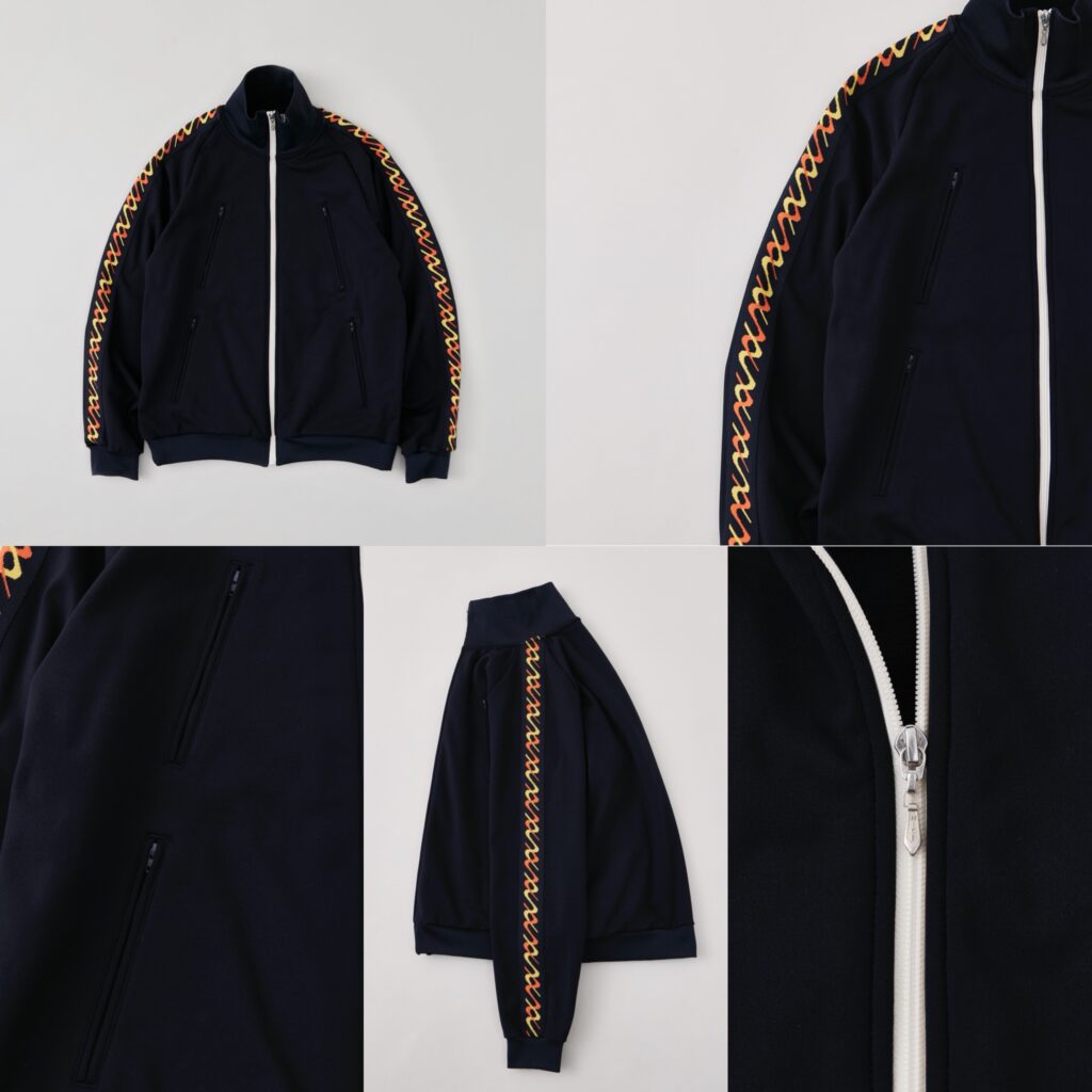1970年代のジャージー組織を現在でも制作できる⽼舗⼯場に依頼し、制作したビスポークジャージー生地を使⽤したトラックジャケット。デザインは1970年代のトラックスーツからインスピレーションを受けています。⽣地は⽢撚りの超⻑綿スビン混と伸縮性に優れたポリエステルを用いて編み立てました。表面はドライな質感でストレッチ性を有し、肌にあたる裏⾯はスビン綿ならではのソフトで快適な着⼼地です。側章のグラフィックデザインやフロントポケットの仕様など随所にヴィンテージ感を漂わせるデザインとなっています。